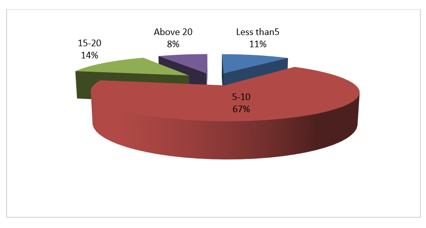 According to figure 2, 4,11% of people share a toilet with 5-10 people, 67% share with 10-15 people, 14% share with 15-20 people, and finally, 8% share with more than 20 people. These results show that the hygiene conditions in the informal settlement of Douala IV are really bad. Many more people are exposed to contagious diseases.