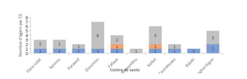 Pour toutes catégories confondues, les agents techniques de santé (ATS) étaient la catégorie la plus représentée 22/34 (64,71%) suivis par les infirmiers diplômés d’état (10/34) soit 29,41% et les sage-femmes (2/34) soit 5,88%. Aucun centre de santé n’était doté en personnel médical (médecin). Les CS de Diountou (préfecture de Lélouma), de Kollet (préfecture de Tougué) et de Donghol-Sigon (préfecture de Mali) étaient des structures les mieux doter en personnel de santé (graphique n°2). Cela s’expliquerait d’une part par leur proximité avec les chefs-lieux des préfectures respectives et d’autre part par leur accès facile, ce qui motiverait les agents d’y rester. Par contre sept (07) centres de santé étaient très enclavés, la nature des pistes et les cours d’eaux rendent les conditions d’accès assez contraignantes (Graphique n°2).