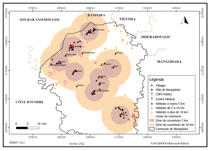 Les coordonnées géographiques des formations sanitaires de Niangoloko ont été obtenues à l’aide de l’application UTM GOE MAT 3.7.7 Installée dans un téléphone portable. Ces coordonnées, converties en fichier de forme « shape file » ont permis la réalisation, des cartes relatives à la répartition spatiale des infrastructures sanitaires avec le logiciel QGIS. En plus de cela, la géolocalisation des centres de santé a permis de déterminer la couverture spatiale et démographique des centres de santé à travers la méthode des zones tampons de 5 km autour de chaque formation sanitaire.