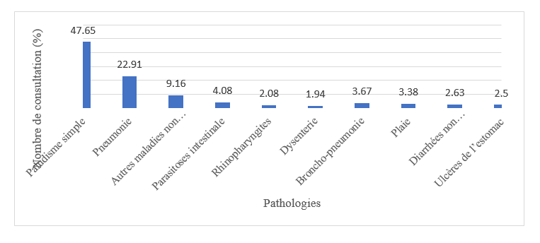 Il ressort du graphique n°1, que le paludisme avec 47,65 % du nombre de consultation est de loin l’affection la plus dominante. La prédominance du paludisme pourrait s’expliquer par le fait des conditions climatiques favorables au maintien et au développement de l’anophèle femelle. Il est suivi par la pneumonie et les maladies non classées avec respectivement 22 ,91 % et 9,16 % des cas de consultation. Au-delà de ces affections, viennent les parasitoses intestinales, les rhinopharyngites, la dysenterie, les broncho-pneumonies, les plaies, les diarrhées non sanguinolentes et les ulcères de l’estomac.