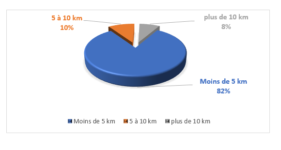 Le graphique n°2 montre que la majorité de population enquêtée parcoure moins de 5 km pour se soigner dans le centre de santé le plus proche. Celle-ci représente 82,22 % des personnes enquêtées. A la suite des personnes parcourant moins de 5 km, viennent celles qui résident ente 5 à 10 km d’un centre de santé. Ces personnes représentent 10 % des personnes enquêtées. Enfin, 8% des enquêtés résident au-delà de 10 km d’un centre de santé. Toutes les personnes résidant loin des centres de santé sont régulièrement confrontées aux aléas du réseau routier surtout en période d’hivernage.